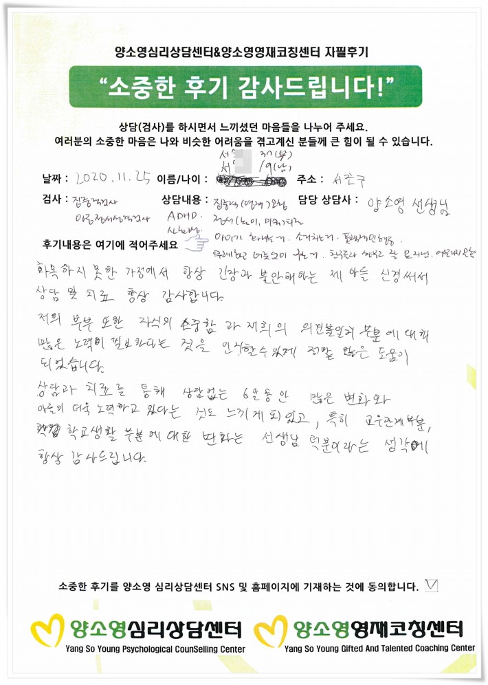 [2020.11.25] 아동상담 / 집중력,아동정서성격검사