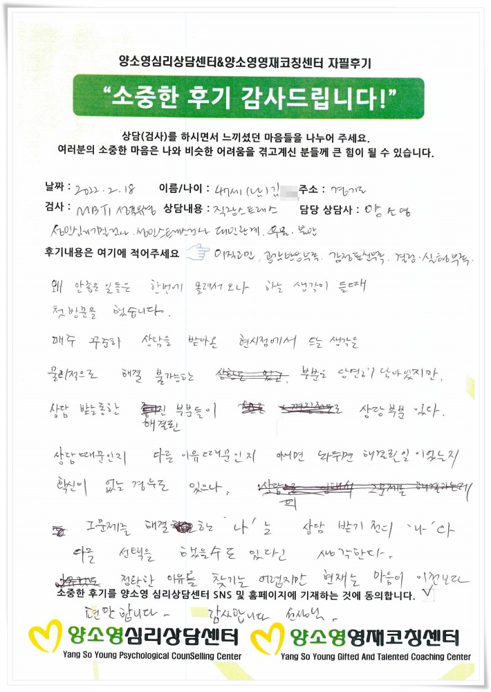 양소영 심리상담센터를 먼저 경험하신