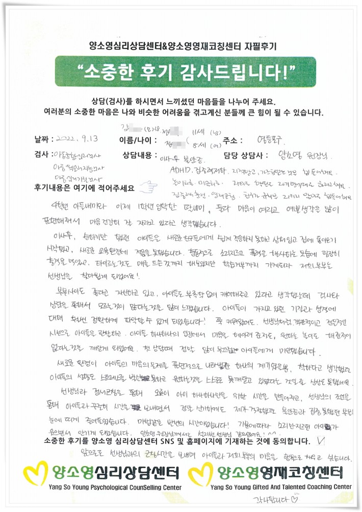 [2022.9.13] 아동상담 / 아동종합심리,웩슬러지능,심리기질검사