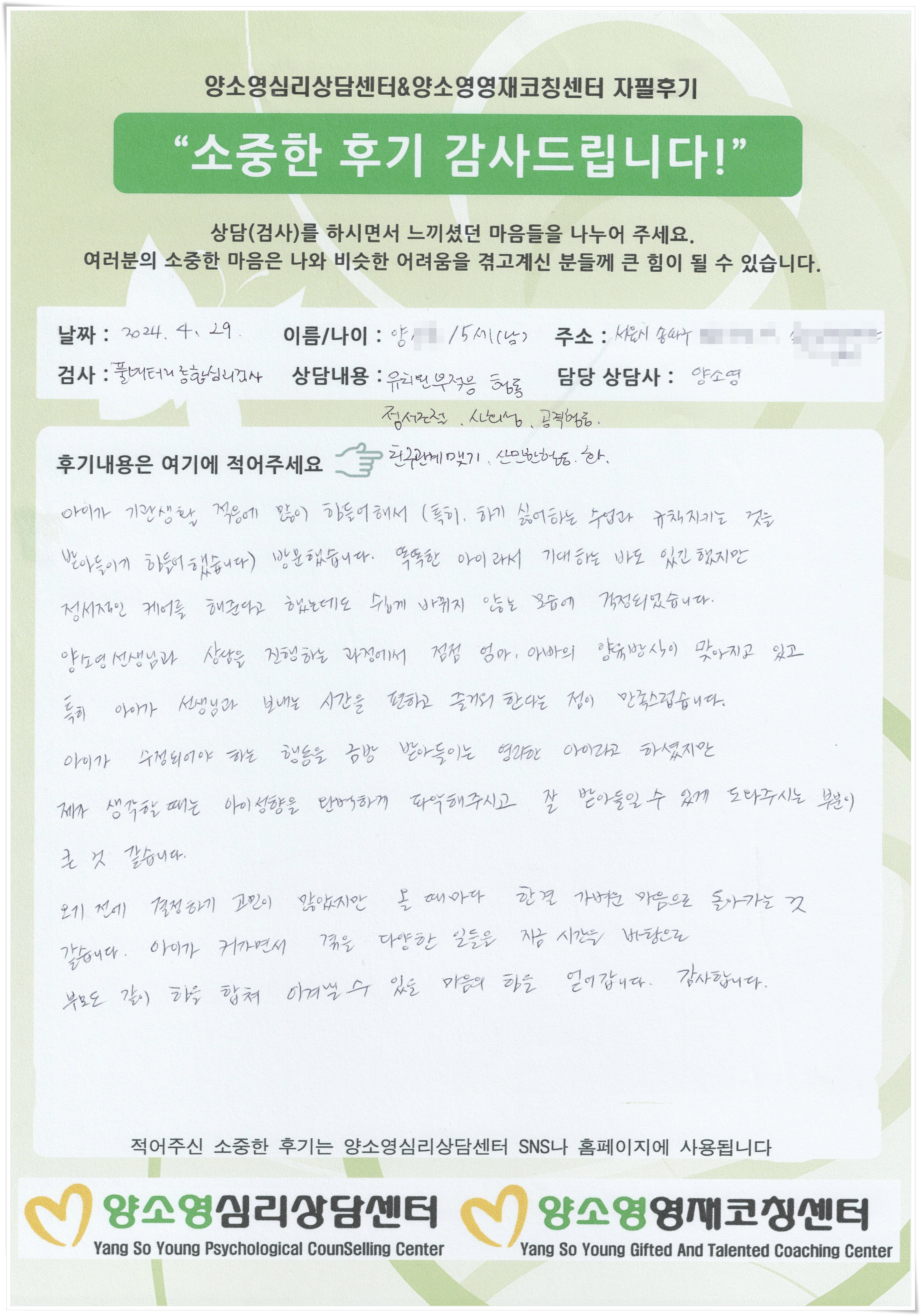 [2024.4.29] 아동심리상담 / 풀배터리 종합심리검사