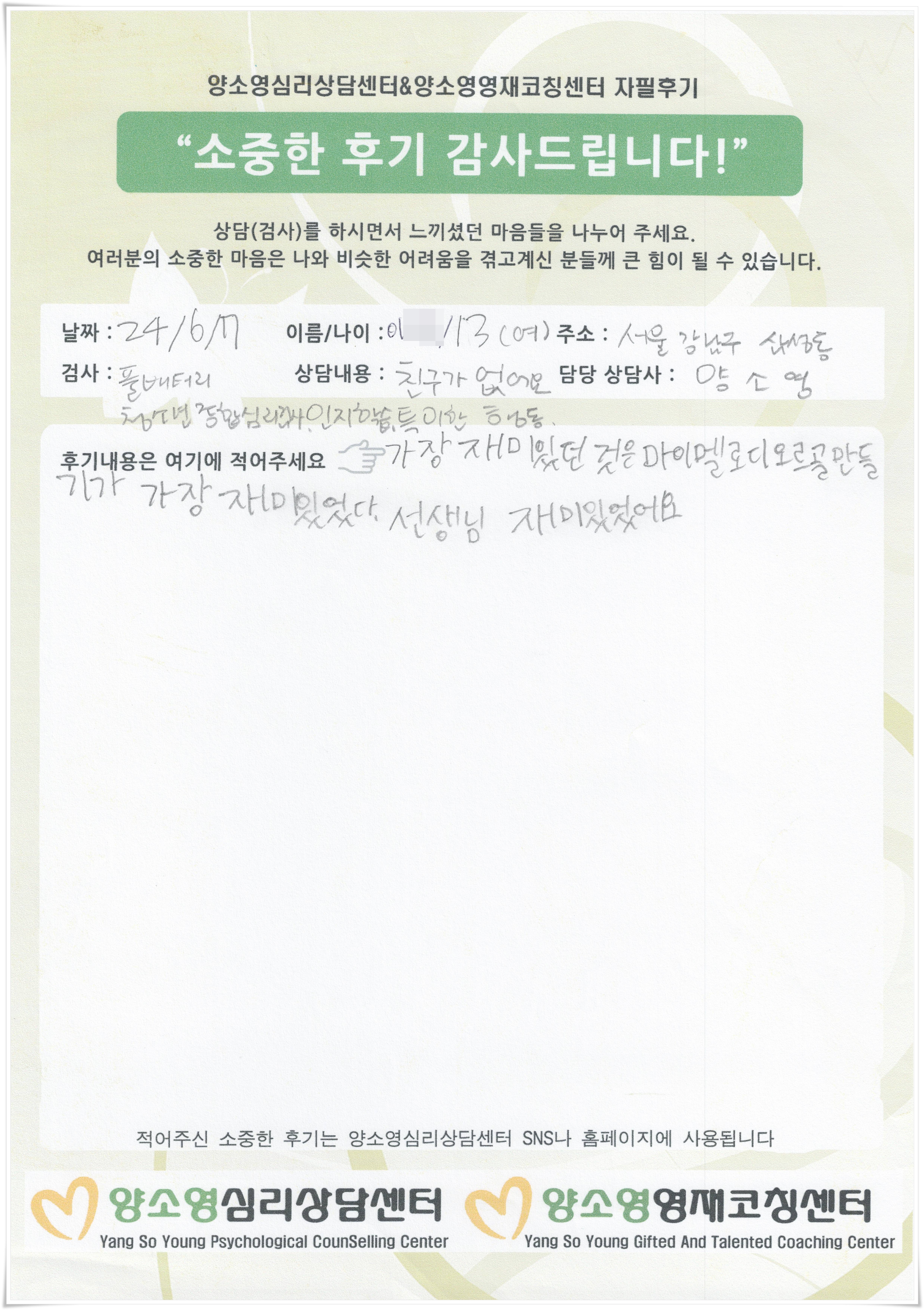 [2024.7.22] 아동심리상담 / 풀배터리종합심리검사