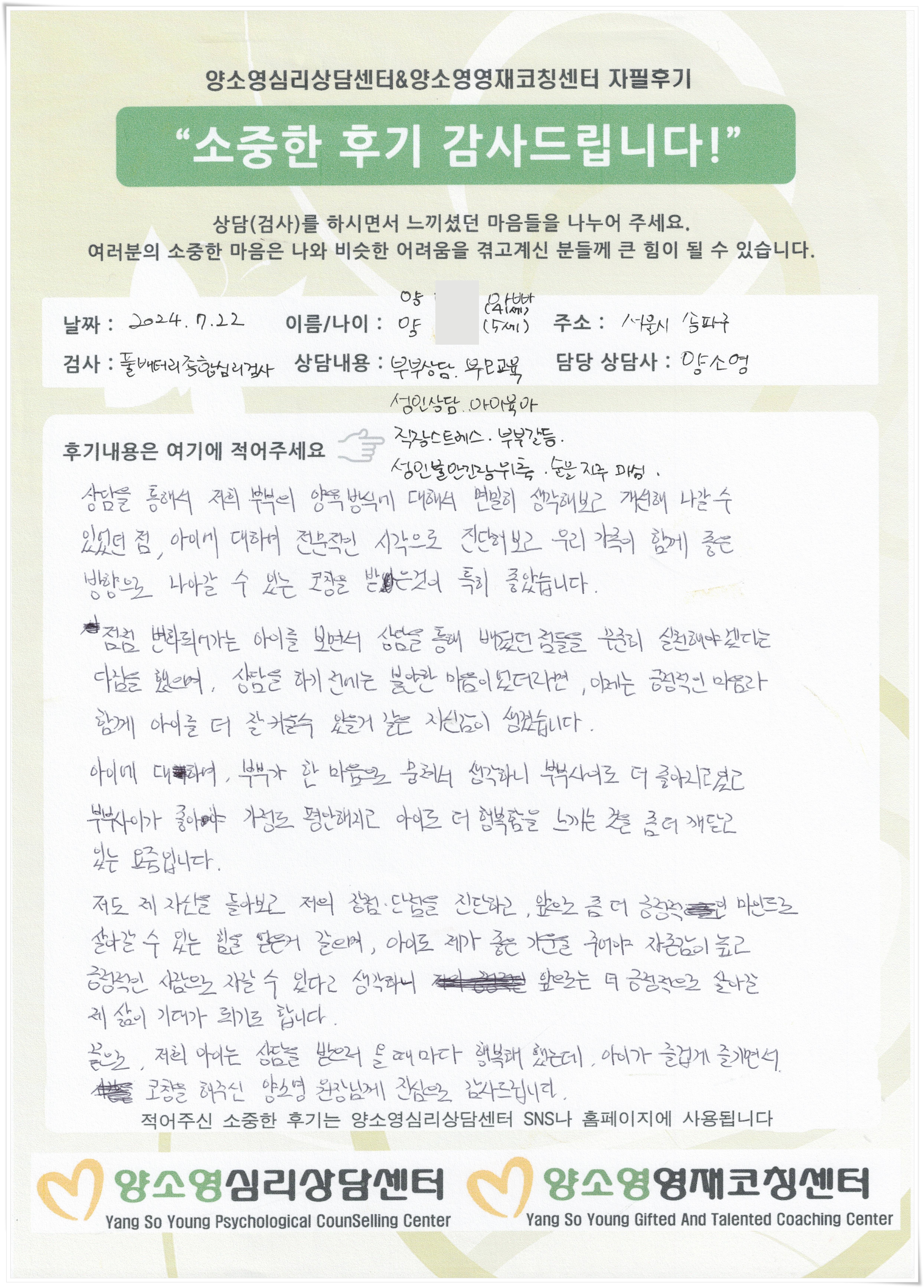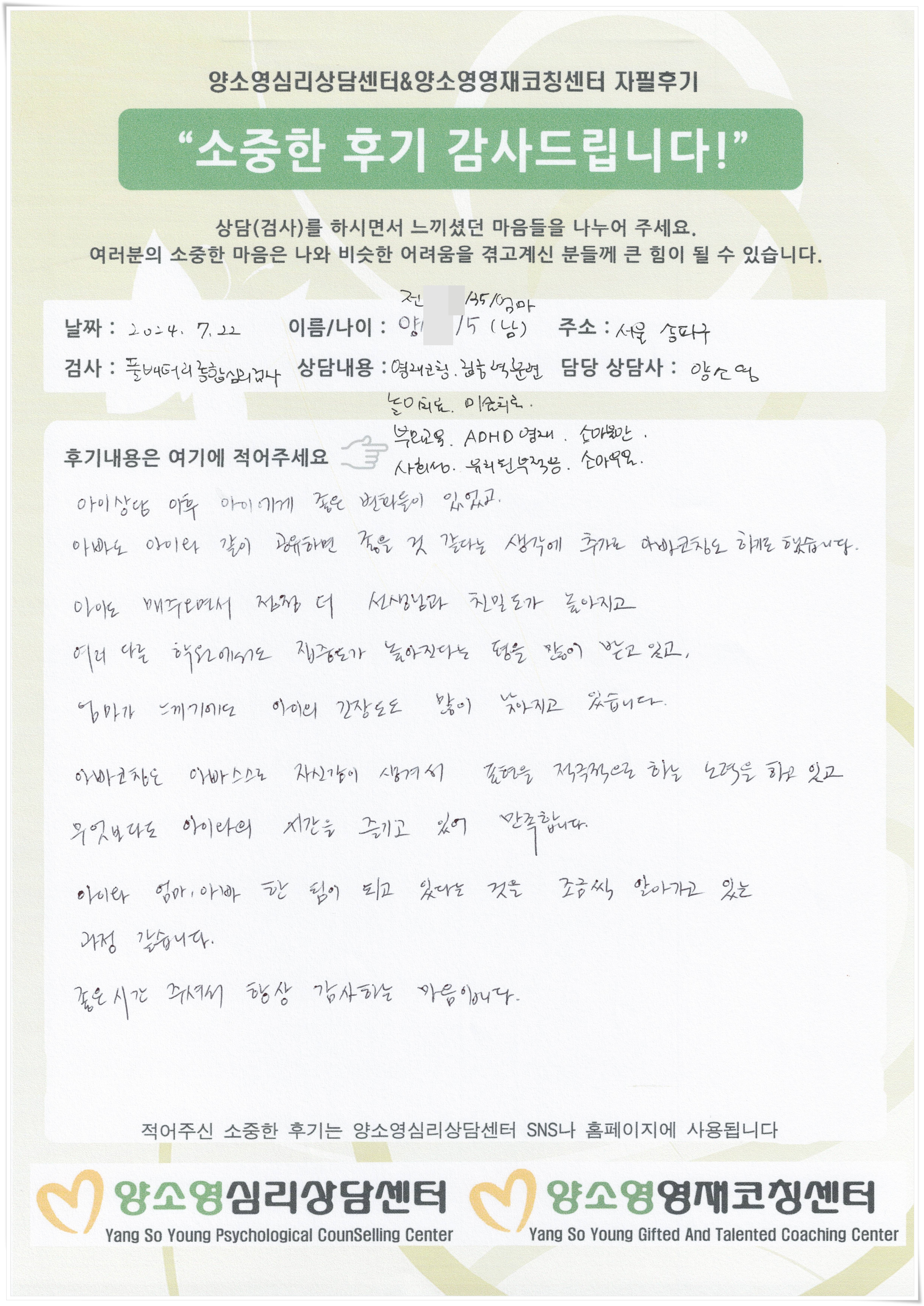 [2024.7.22] 아동심리상담 / 풀배터리종합심리검사