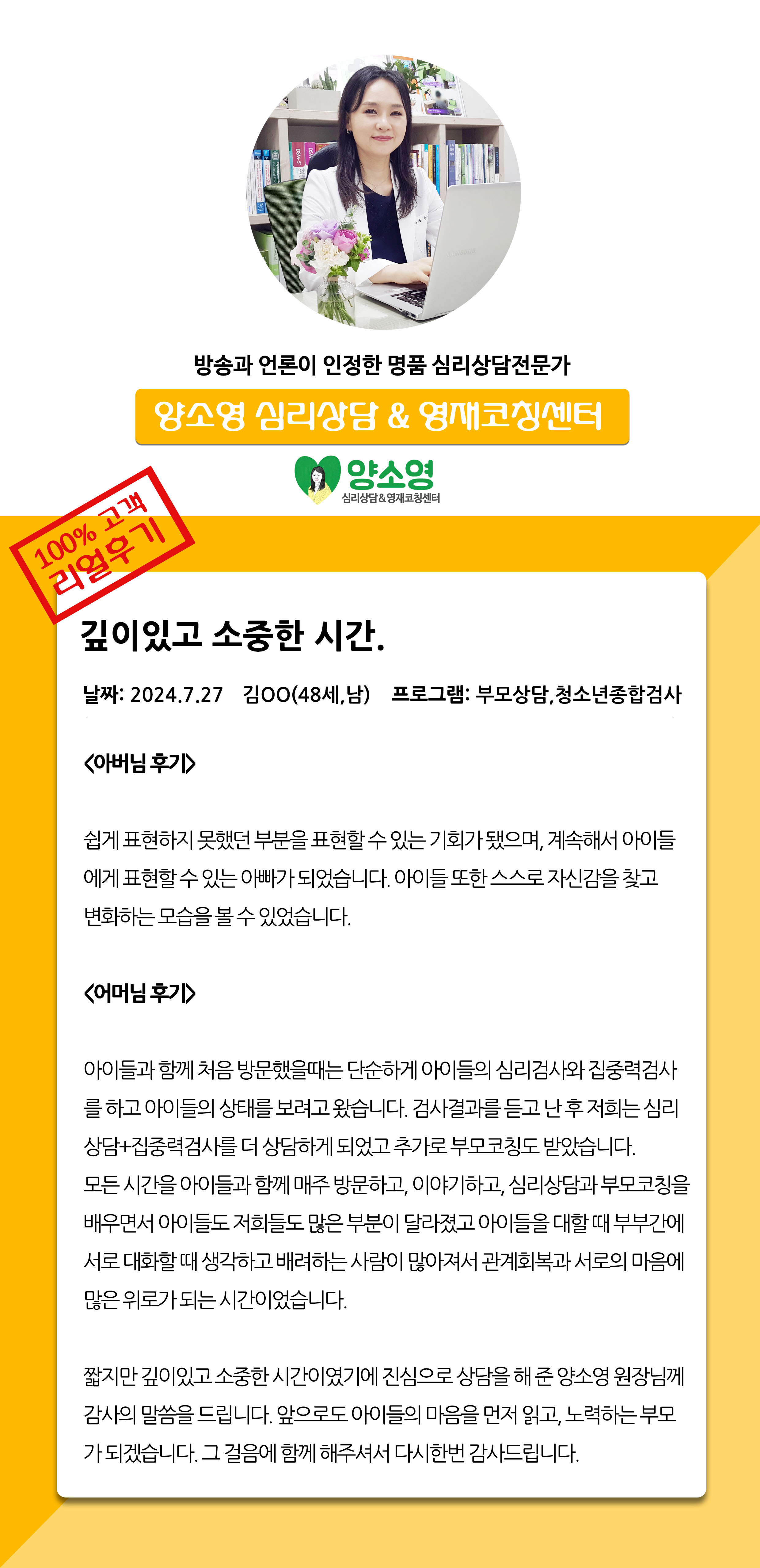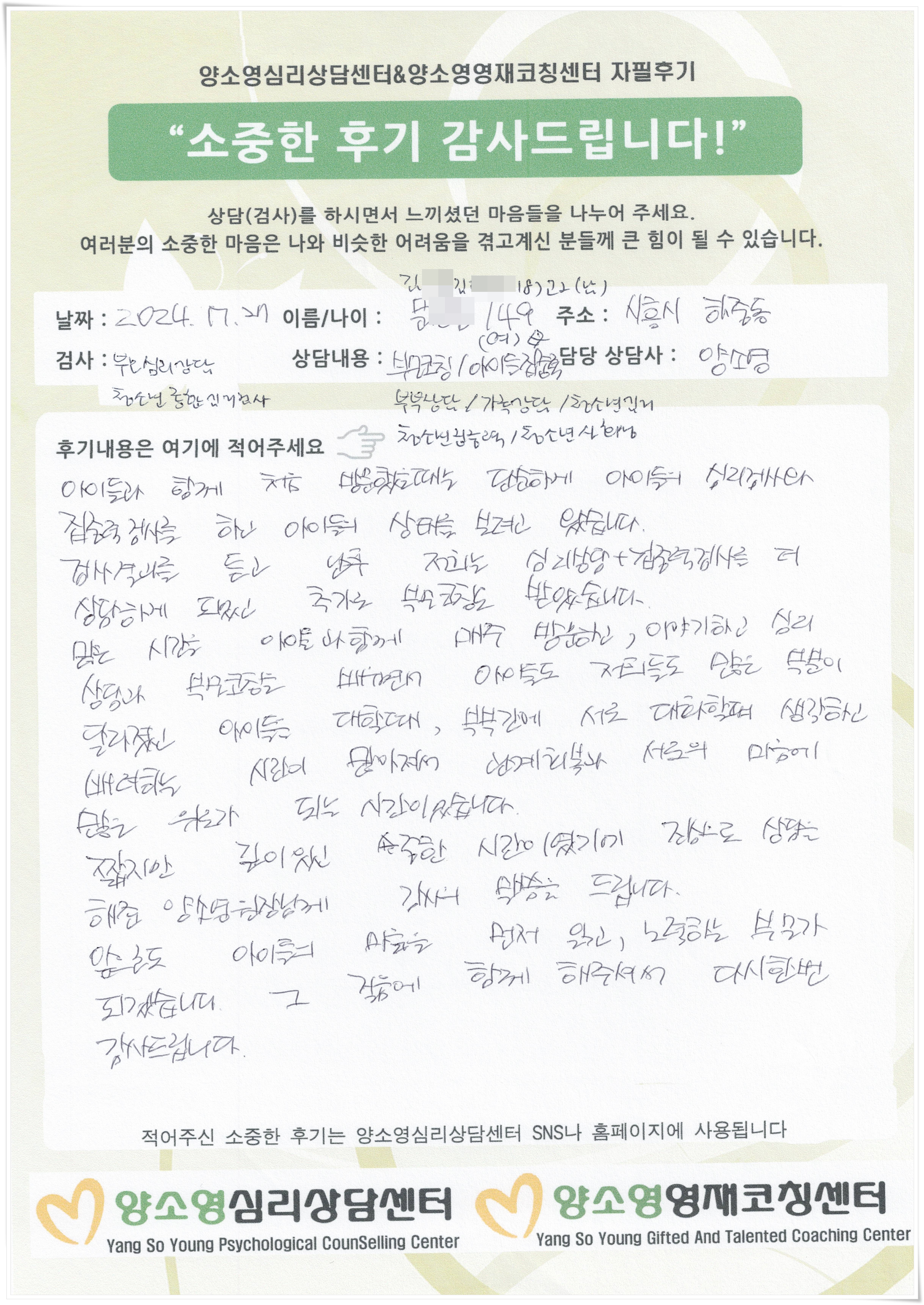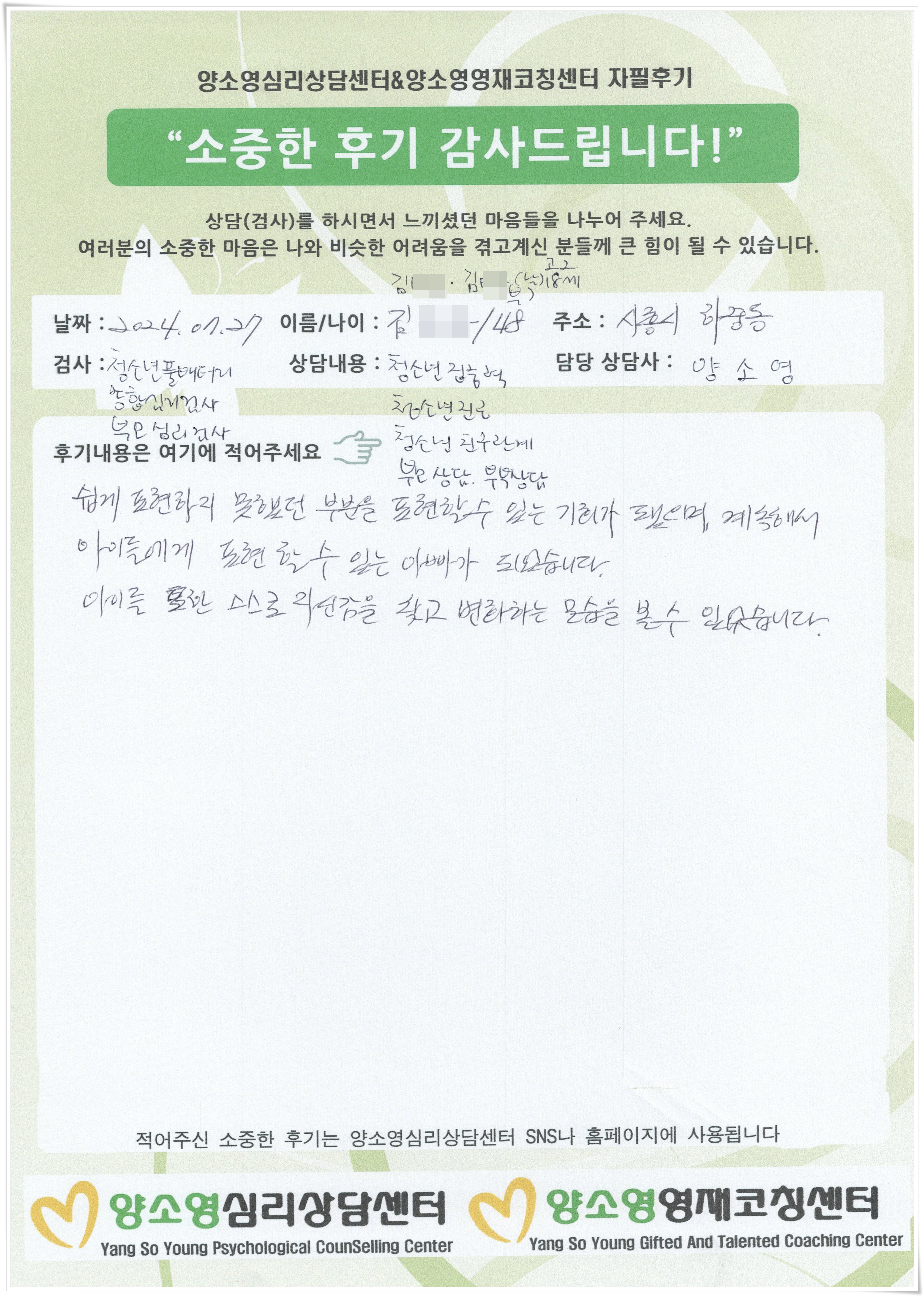 [2024.7.27] 성인심리상담 / 부모상담,청소년종합심리검사