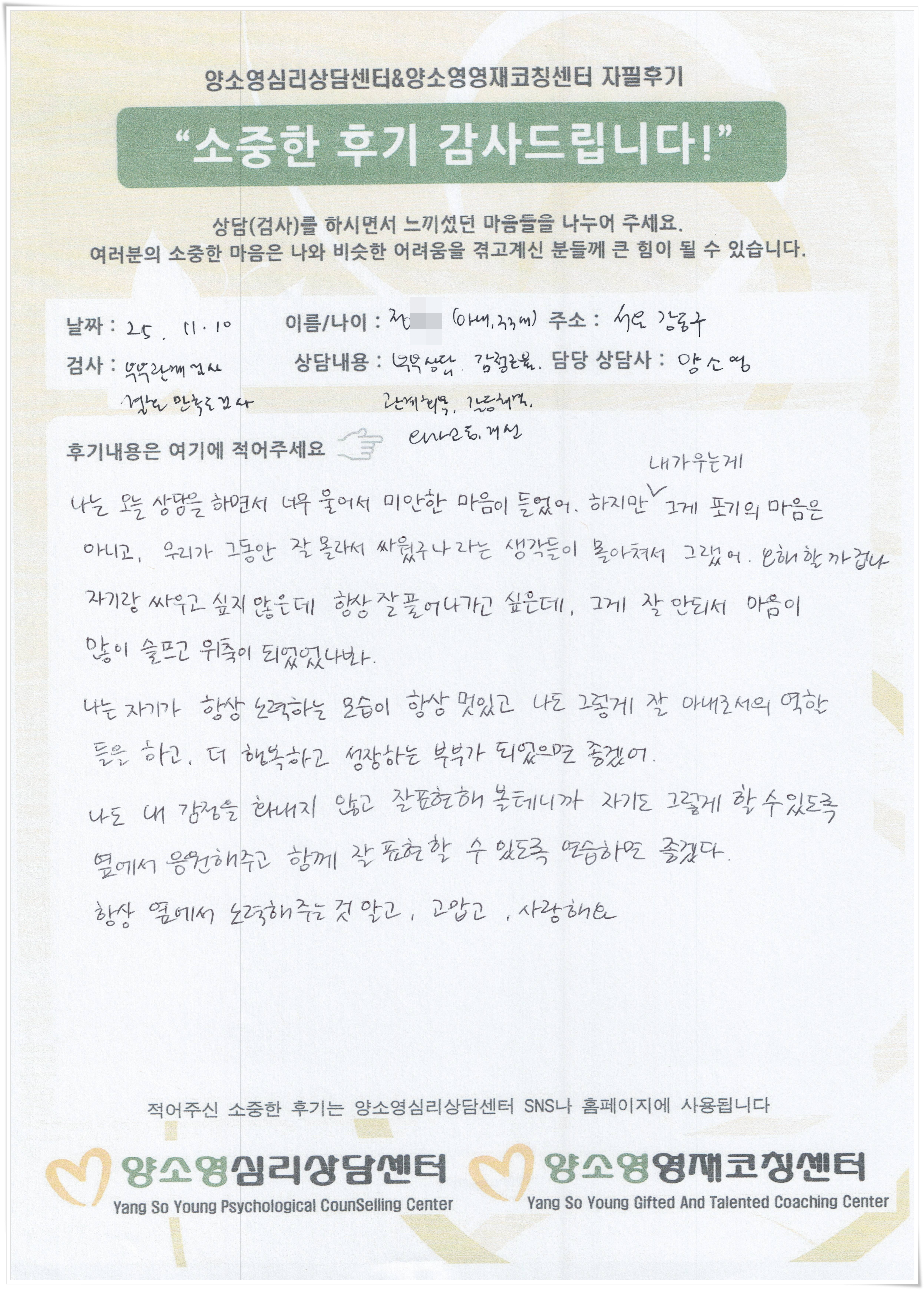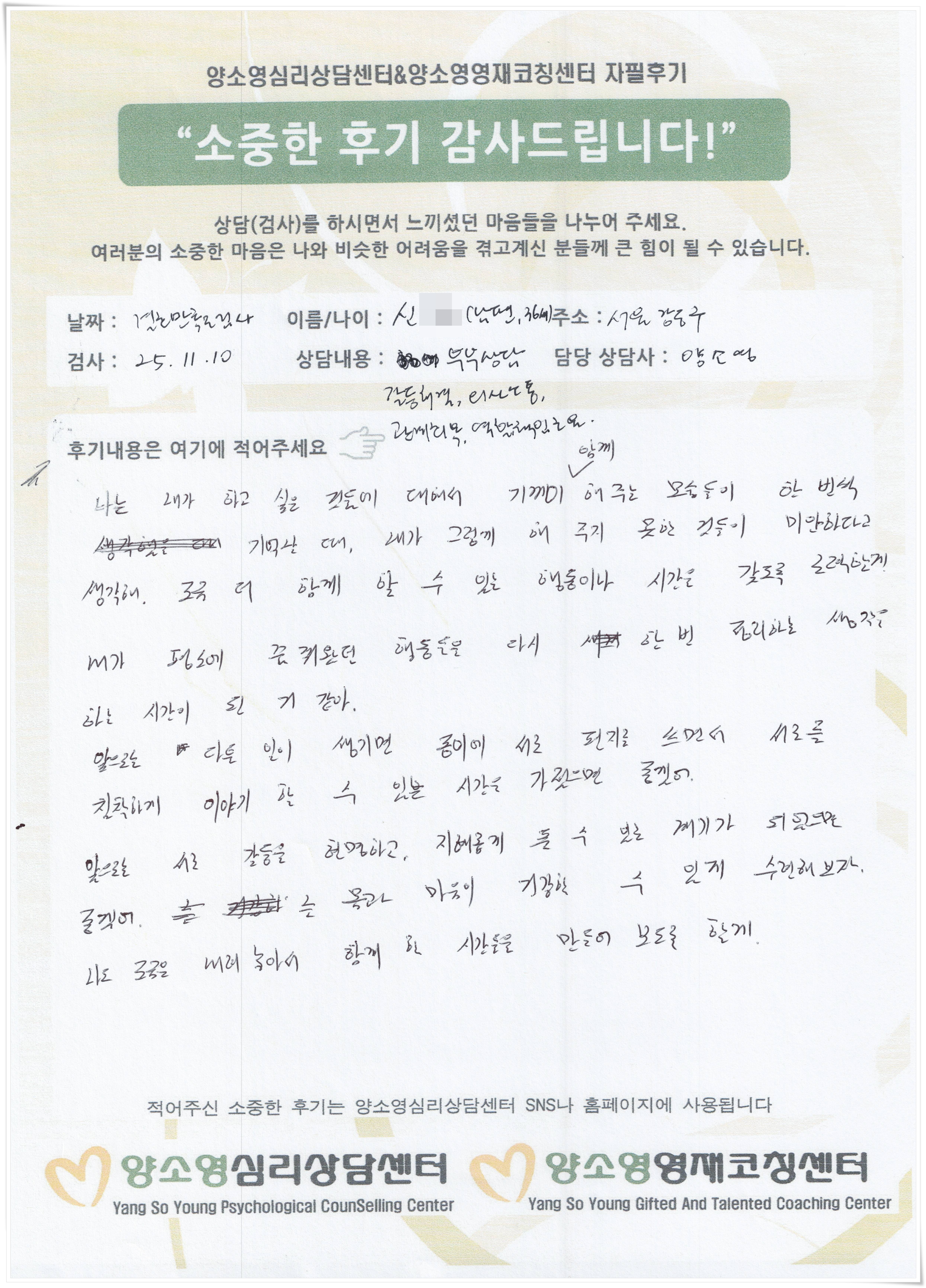 양소영 심리상담센터를 먼저 경험하신